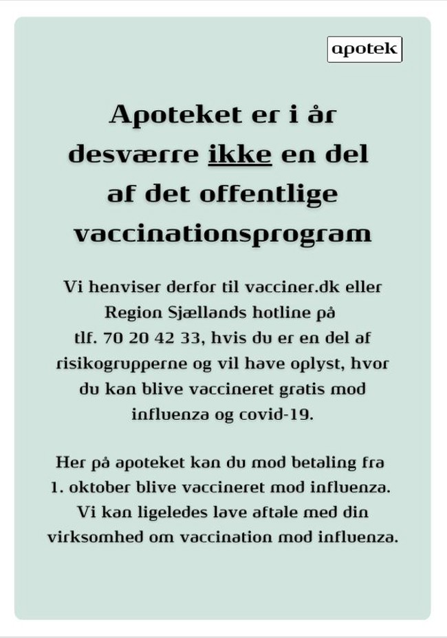 Her på apoteket kan du fra 1. oktober 2025 blive vaccineret mod influenza mod betaling .